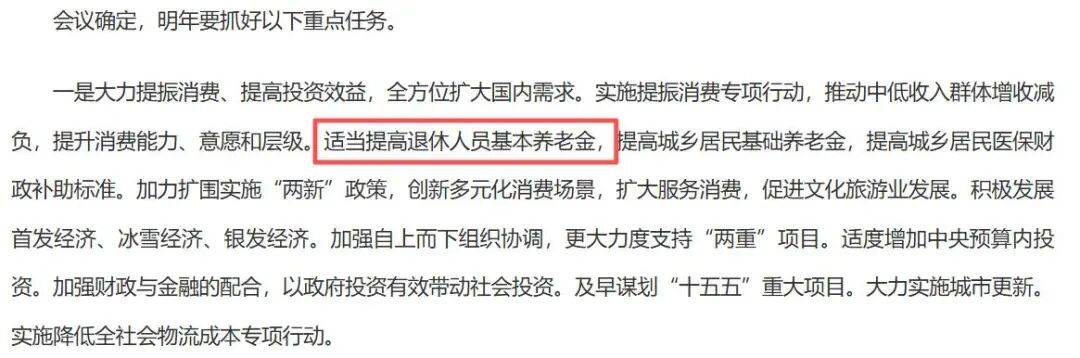 2024年的中央经济工作会议确定明年(即2025年)要抓好以下重点任务,一是大力提振消费、提高投资效益,全方位扩大国内需求,这点里明确提到“适当提高退休人员基本养老金”。
